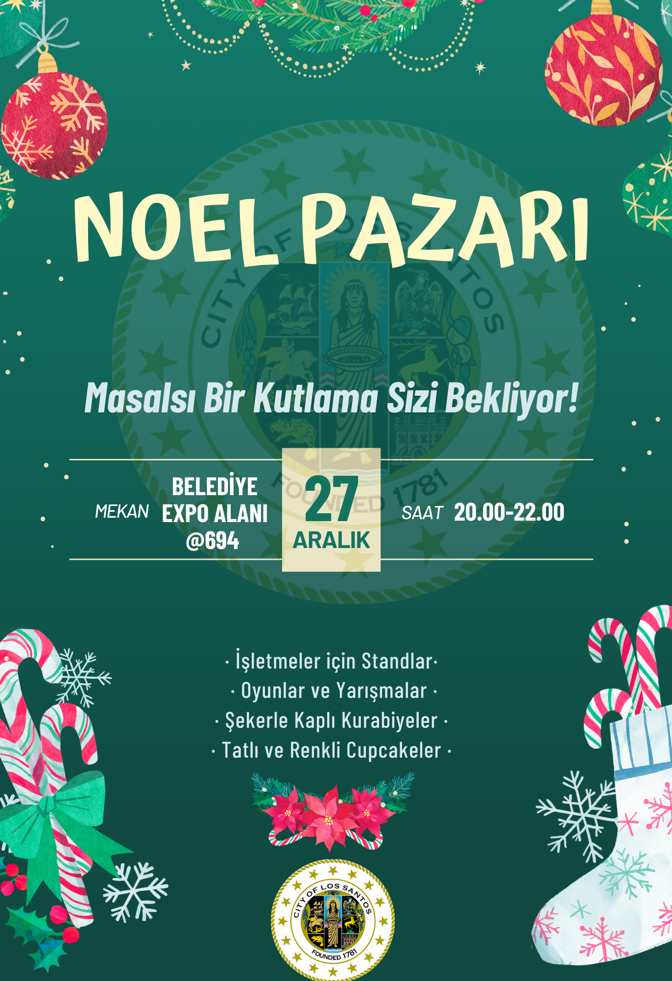Los Santos Belediyesi, 27 Aralık’ta şehrimizin kalbine sıcaklık ve neşe katacak Noel Pazarı düzenliyor!