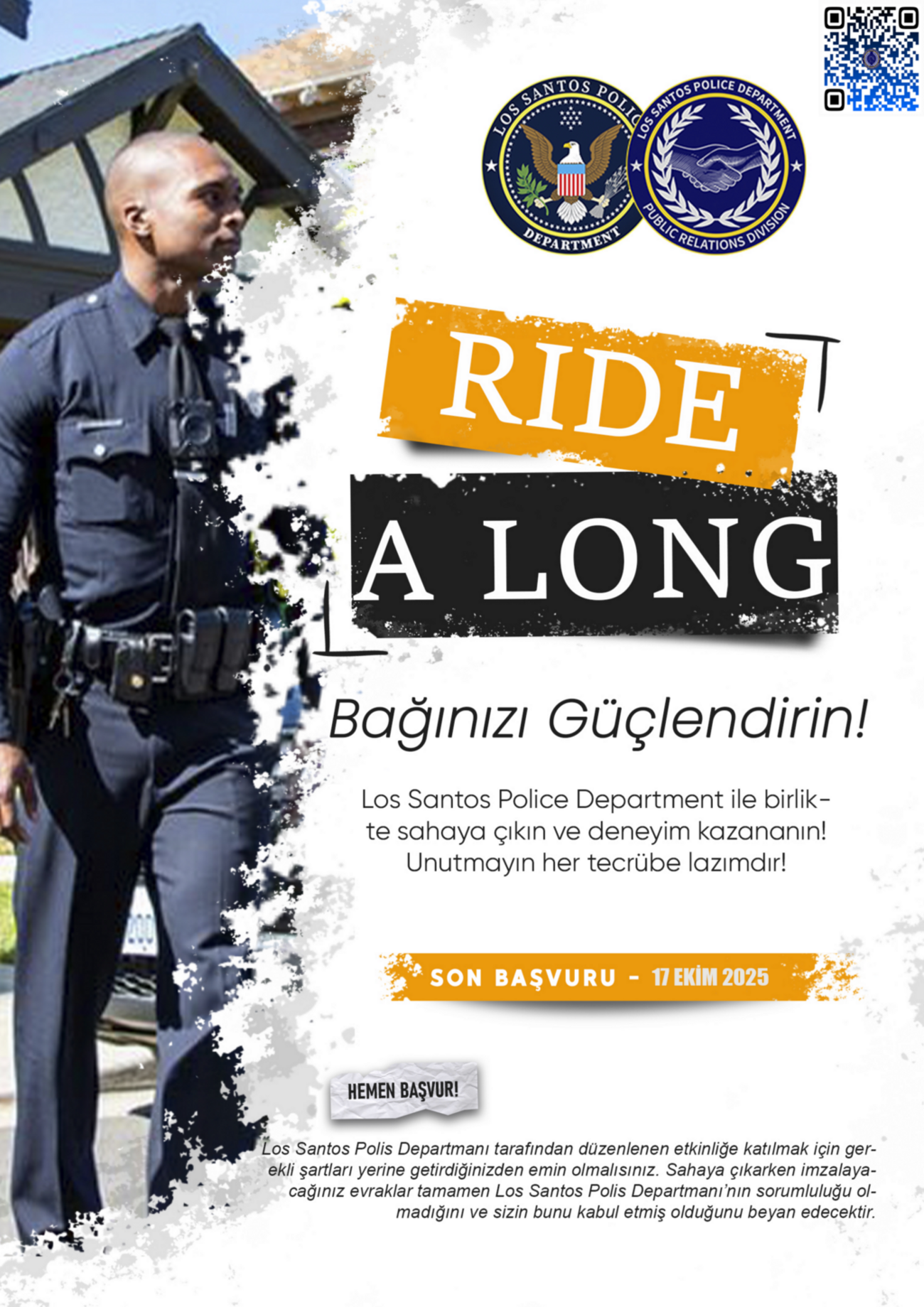 Los Santos Polis Departmanı için başvurular açıldı. Başvurular 30.10.2025, 23:59 tarihine kadar sürecek. Kabul edilen adaylar polis akademisine alınacak ve saha eğitimi için hazır hale getirilecektir.